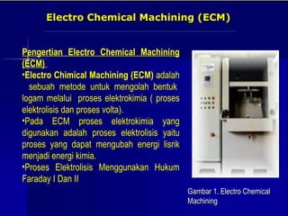 . Electro Chemical Grinding ECG Prinsip Kerja ECM Di dalam proses ECG batu gerinda berfungsi sebagai katoda dan benda kerja sebagai anoda dari pada sel elektrolit yang terbentuk oleh cairan elektrolit yang berada dianatara kedua benda tersebut diatas. Salah satu mesin manufaktur non-konvesional yang sekarang popular digunakan adalah Wire Cut machining. Arus yang digunakan adalah 265 A 25 A 18 A 125 A 6 A 15.